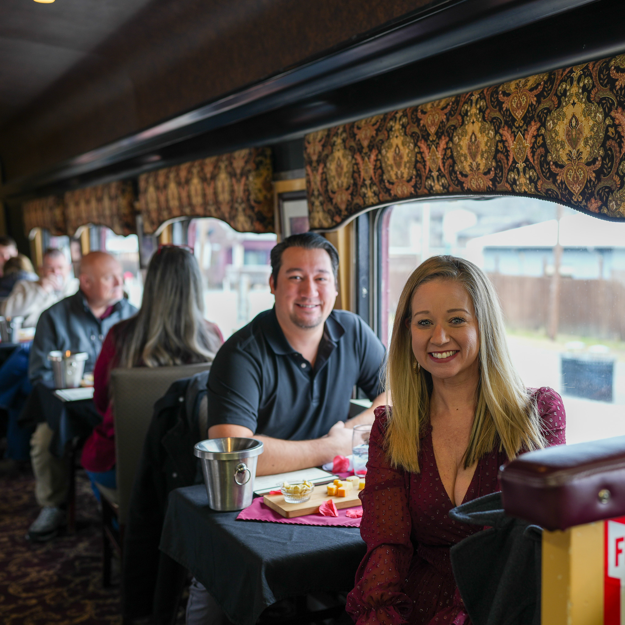 Passengers will enjoy a full service All-Adult First Class ride in our First Class cars with a private attendant and plush well-appointed dining seating. A narrator will accompany the ride to present each pour to guests and share knowledge and history of the wines selected. Passengers on this specialty car will enjoy an exclusive sampling of cheeses and a surf and turf meal prepared fresh. We have carefully selected our wine samples to accompany the meal.